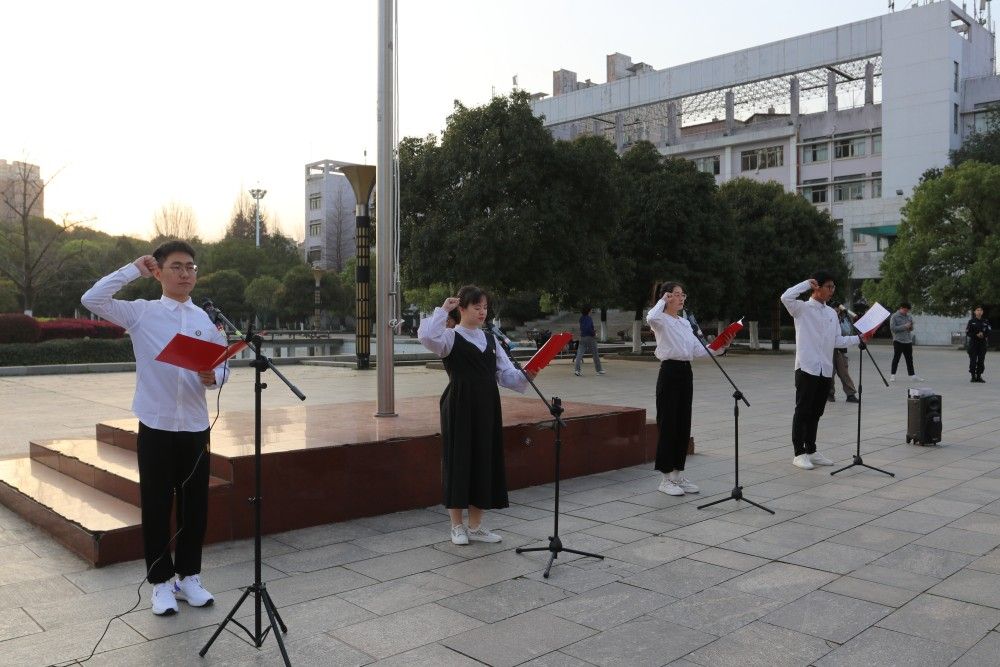 院诗文朗诵队的4位队员,通过朗诵讲述了党的十八大到二十大以来国家全面发展的伟大成就,特别是新时代十年来的伟大变革,表达了新时代大学生“奋斗正青春,青春献给党”的心声。朗诵完毕后,朗诵队员带领全体学生共同在国旗下宣誓。