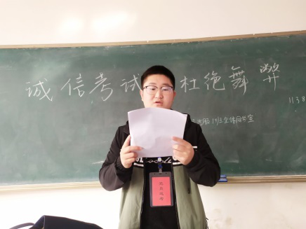 在巡考过程中,巡考人员佩戴“党员巡考”工作牌,在考试前10分钟进入各个考场,向全体同学宣读《材料科学与工程学院考试违纪警示告知书》,并在宣读完毕后协助监考老师让同学们将手机、智能手表等电子设备和复习资料交到指定地方。