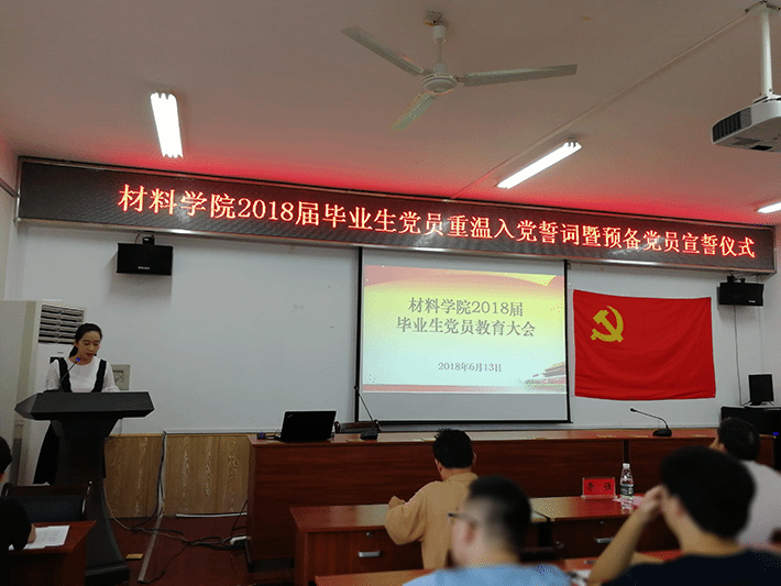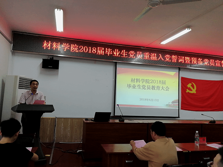 6月13日下午,材料学院在逸夫楼540举行毕业生党员教育大会。学校党委组织部副部长赵培瑞、学院党委书记李强、副处级组织员陶国华、学工办老师成璐、王艳辉以及全体毕业生党员参加了会议。会议由陶国华主持。