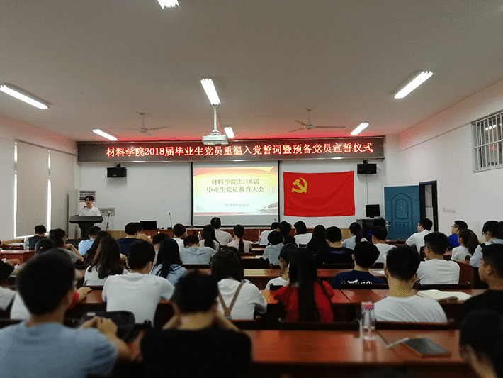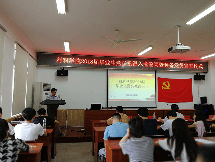 教育大会分两个环节进行,首先进行了毕业生党员重温入党誓词暨预备党员宣誓仪式。奏唱国际歌后,李强宣读2018届毕业生宣誓党员名单,毕业生党员代表杨振飞带领全体毕业生党员面向党旗庄严宣誓。毕业生新党员代表徐雷涛、优秀学生党员代表祖海洋分别发言,他们向学校学院党委、老师们致以深深的感谢,感谢一直以来的培养和支持,代表全体毕业生党员承诺在以后的工作和生活中时刻谨记自己的党员身份,时刻以党员的标准严格要求自己,肩负起时代赋予的历史使命,振兴祖国,回报社会。