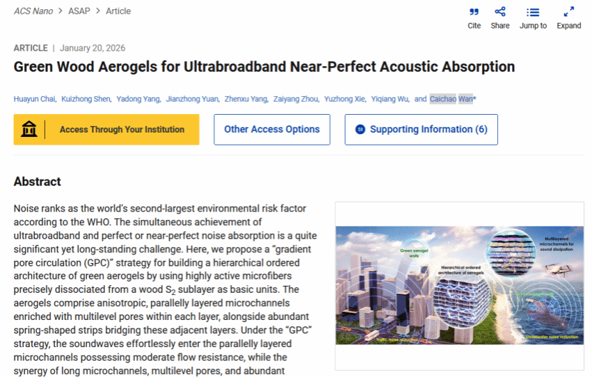 近日,我院吴义强院士、万才超教授团队联合中国林科院林化所、悉尼大学,在国际知名期刊《ACS Nano》发表了题为“Green Wood Aerogels for Ultrabroadband Near-Perfect Acoustic Absorption”(梯度孔循环策略构筑超宽频吸声木质气凝胶)的研究论文。中南林业科技大学为第一完成单位,我院硕士研究生柴化云为第一作者,该成果得到了国家自然科学基金重大项目等支持。