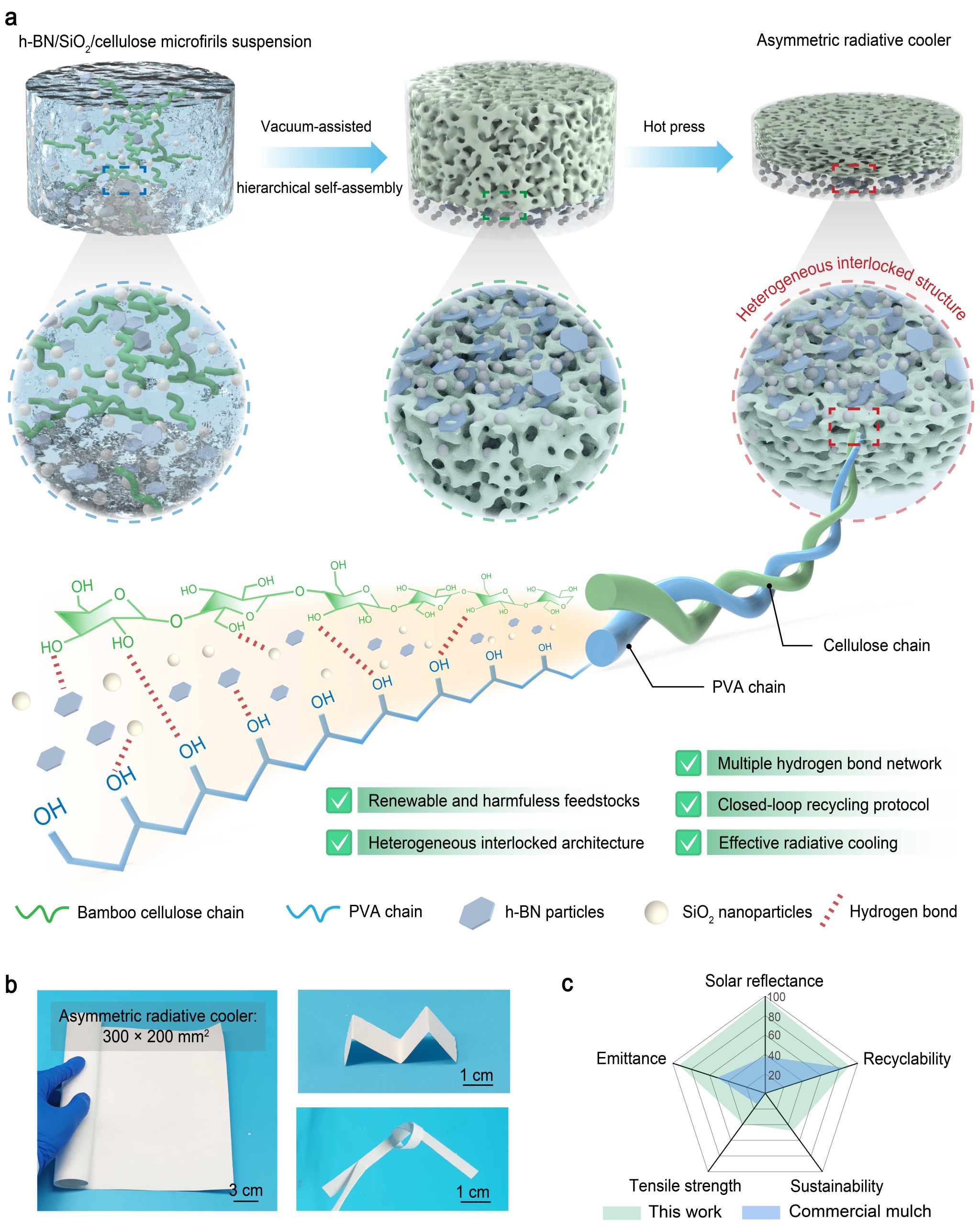近日,我院吴义强院士、何帅明教授研究团队在国际知名期刊《ACS Nano》发表了题为"Strong, Recyclable, and Sustainable Radiative Cooler with Heterogeneous Interlocking Architecture for Agricultural Thermal Management"(一种坚固、可回收且可持续的异质互锁结构辐射制冷器用于农业热管理)的研究论文。我院博士研究生林贤铣为第一作者,吴义强院士与何帅明教授为该论文的通讯作者,中南林业科技大学为唯一完成单位,该成果得到了国家自然科学基金等项目支持。随着全球气候变暖和能源危机的加剧,开发高效的被动制冷技术对于缓解农业热应激和保障粮食安全具有重要意义。传统的石油化工基辐射制冷材料虽然能够实现一定的制冷效果,但面临持久性废弃物带来的环境挑战;而新兴的生物质替代材料则往往存在制冷性能不足、机械强度差及耐久性有限等问题。因此,开发一种兼具高制冷性能、优异机械强度和可持续循环利用的新型辐射制冷材料成为当前研究热点。这篇文章深入研究了异质互锁结构的构筑策略及其光学特性与力学特性,开发出一种一体化、高强度、可回收的竹基辐射制冷材料。该材料以竹纤维为基质,运用真空辅助分级自组装策略,将纳米颗粒引入连续的聚合物网络中,构筑成异质互锁的多层次结构。文章进一步探讨了该材料在农业热管理方面的能力,并深入解析了其力学性能增强与高效光散射的机制。该材料展现出98.1%的太阳反射率和93.2%的红外发射率,实现了低于环境温度的制冷效果,同时具有38.7 MPa的高抗拉强度,显著优于商用反射地膜。田间试验表明,该材料可使土壤温度较裸土降低4.6℃、较商用地膜降低2.4℃,同时抑制土壤蒸发并提高作物产量。尤为关键的是,该材料可通过温和的水介导回收工艺高效再生,回收率超过90%,大幅减轻了农业废弃物对环境造成的负担。最后,文章指出该竹基辐射制冷材料有望应用于温室农业节能领域,为加速开发高性能、生态友好型农业热管理复合材料提供新型解决方案。