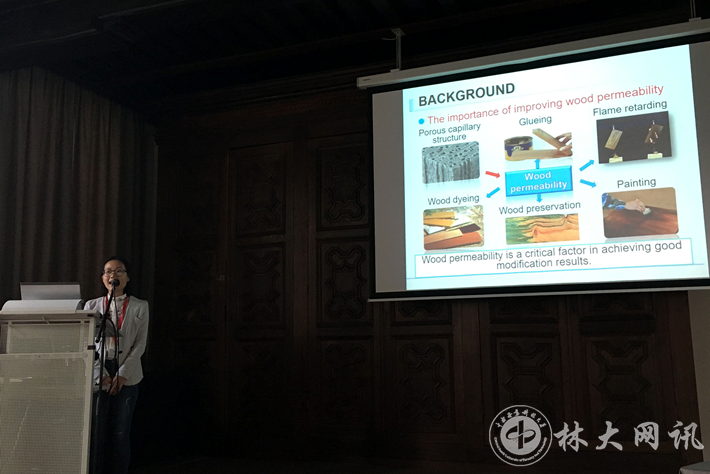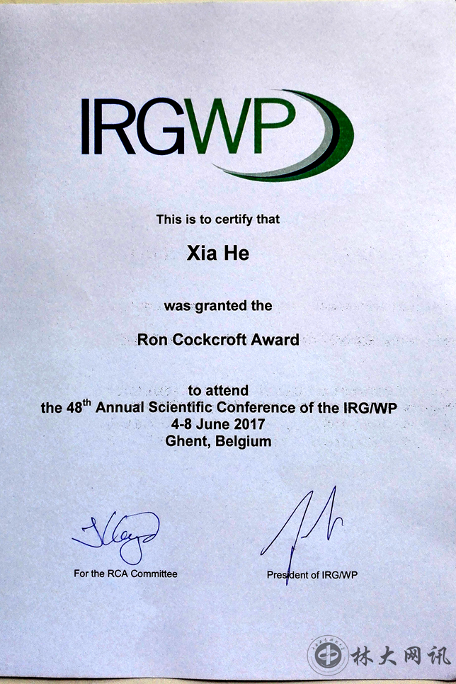 近日,在国际木材保护组织和国家自然科学基金项目(编号:NO.31370564)经费的资助下,学校材料科学与工程学院木材科学与技术学科在读博士贺霞赴比利时出席第48届国际木材保护年会,她在会上做了题为“Permeability of Eucalyptus Wood Improved by Microwave Treatment”的学术报告,并被国际木材保护研究组织(IRGWP)授予2017年度Ron Cockcroft Award奖。据悉,贺霞是我国大陆地区唯一出席本次会议并获奖的学生代表。