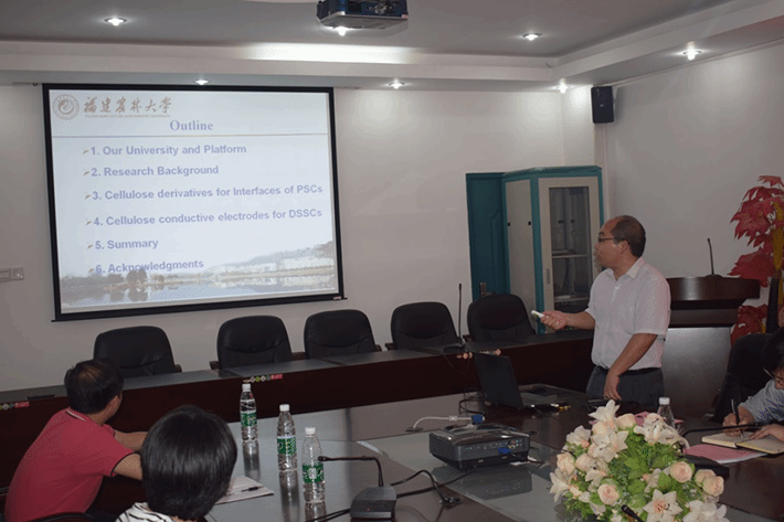 应材料科学与工程学院的邀请,福建农林大学欧阳新华教授于2018年5月14日访问我院,并为我院师生作了题为“High-efficient organic solar cells by employing cellulose and its derivatives”的学术报告。我院师生共50余人参加了本次客座教授授聘仪式和学术报告会。