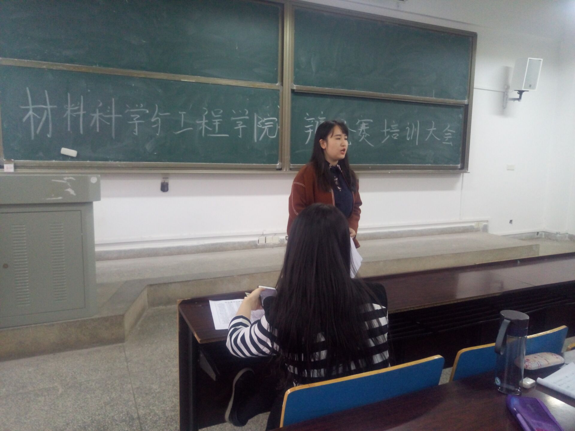10月13日(周五)中午12:20-1:20在主教北401举办材料学院辩论赛培训会,到会嘉宾有辩论队队长吴慕白、副队长牟玉姝、团委学生会主席、辩论队副队长田奋扬,现场培训学员100余人,你没有听错,30个队伍,120人,这场比赛参与度可谓是令人叹为观止!