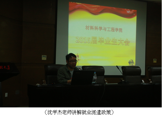 524日,材料学院在图书馆报告厅召开毕业生大会,学校招生就业处就业指导科科长沈学杰、学党委书记张仕吉、党委副书记乔建政、辅导员张哲、李伟坡和2012级毕业生近240多人出席大会。会议由辅导员李伟坡主持。