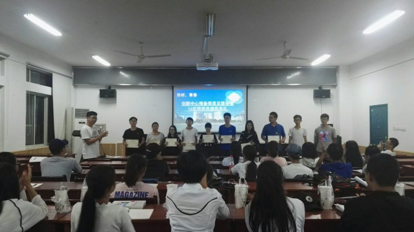 为培养新学员们的团结意识和集体荣誉感,也为鼓励和奖励16级优秀的学员们,激励17新学员, 9月29日20:00创新中心于逸夫楼540召开了2017级预备学员见面会暨16级优秀学员颁奖典礼。本次会议由学生会副主席、创新中心主任应明主持,学生会主席田奋扬和上届创新中心副主任王鹏飞到场并担任颁奖嘉宾。