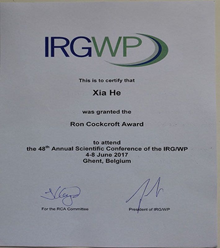 2017年6月3-10日,在国际木材保护组织和国家自然科学基金(项目编号:NO.31370564)项目经费的资助下,我校材料科学与工程学院木材科学与技术学科博士生贺霞赴比利时出席第48届国际木材保护年会,她在会上做了题为“Permeability of Eucalyptus Wood Improved by Microwave Treatment”的学术报告,并被国际木材保护研究组织(IRGWP)授予2017年度Ron Cockcroft Award奖。贺霞博士是我国大陆地区唯一出席此次会议并获奖的学生代表。