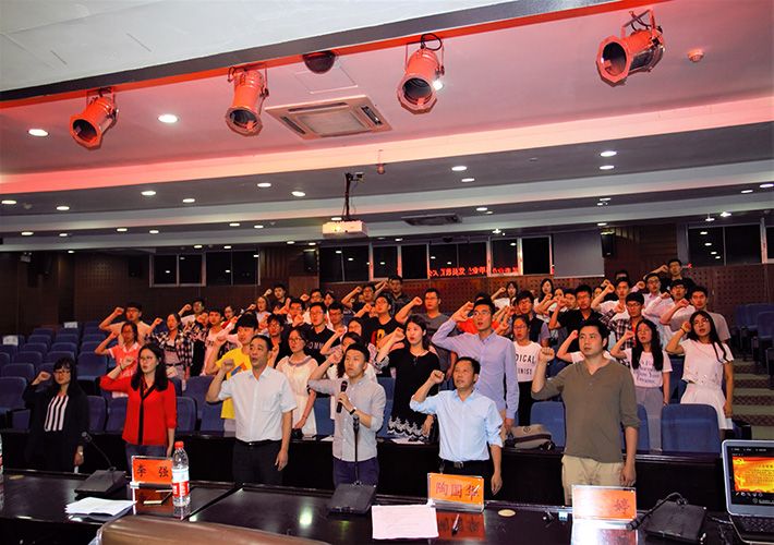 大会在国际歌的旋律中拉开帷幕,优秀党员毕业生李家琪带领所有成员重温入党誓词。