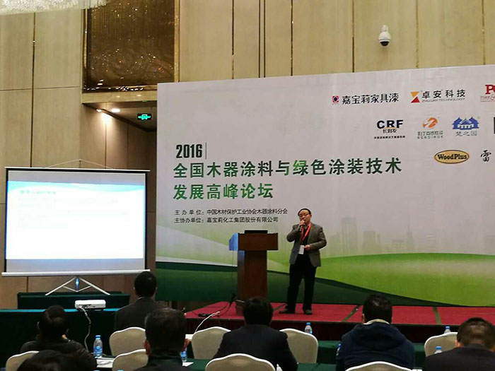 2016年12月10日,中国木材保护工业协会木器涂料分会成立大会暨全国木器涂料与绿色涂装技术发展高峰论坛在苏州召开,工信部原材料司胡润华,木材节约发展中心主任刘能文、副主任喻迺秋,中国木材保护工业协会会长陶以明,以及中国工程院院士李坚,中南林业科技大学副校长吴义强,美国VIANCE公司研发部主任金乐红,国际炭化木协会会长Mr.Jukka Ala-Viikari,芬兰木材委员会执行总裁Mr.Mikko Viljakainen,嘉宝莉化工集团股份有限公司家具漆事业部市场部总监刘军山等来自于海内外政府代表、行业组织、专家学者、知名企业负责人300余人齐聚一堂,围绕木材技术创新与应用、木器涂料与绿色涂装技术等主题开展深入分析和讨论,以此推动绿色木材工业可持续发展。