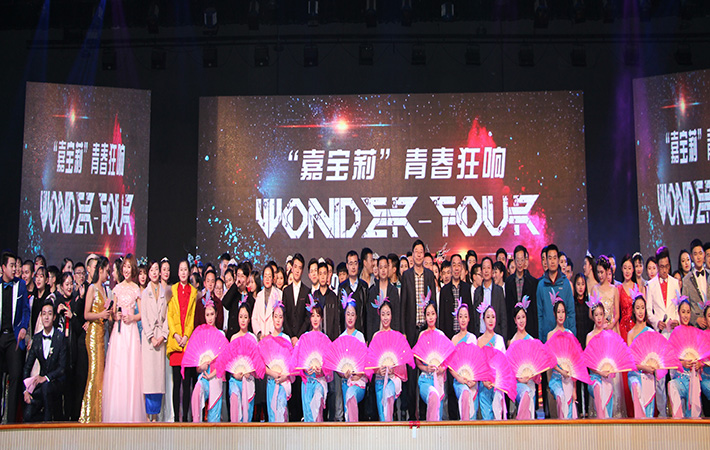12月23日晚7点,由外国语学院、环境学院、理学院、材料学院联合举办的“青春狂响Wonder Four”四院联合元旦晚会在体艺馆璀璨上演。三千名师生共享饱含美好愿景的视听盛宴。学校副校长严曙光教授、陈冬林教授、吴义强教授,嘉宝莉家具漆培训学院院长郭志伟、导师叶羽,学校学生工作部、保卫处、招生就业处、校团委、场馆中心等有关部门、四个学院党政负责人共同出席晚会,师生共赏晚会,一同迎接新年,共度难忘良宵。晚会由嘉宝莉化工集团股份有限公司独家冠名。