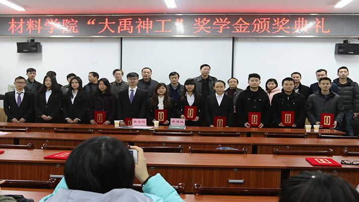 11月16日,材料科学与工程学院在逸夫楼540举行了“大禹神工奖学金”颁奖典礼。出席颁奖典礼的嘉宾有长沙大禹建筑防水工程有限公司董事长曹望远、总经理曹迈宇、总经理助理方芳、财务经理马菊芳、销售副总仲维斌、企划主管卢文彬、技术部长陈高、材料科学与工程学院党委书记张仕吉、党委副书记乔建政,高分子教研室教授廖有为。并有获奖学生及部分学生代表参加了颁奖典礼。本次颁奖典礼由乔建政主持。