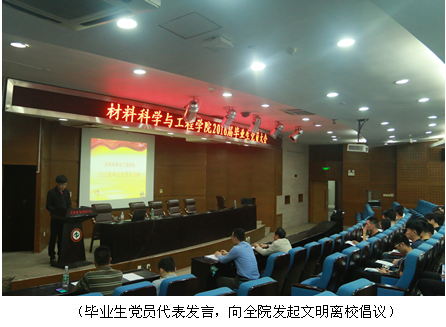 毕业生党员柳强代表全体毕业生党员发言:“今日我以材院为荣,明日材院以我为荣”。我们即将踏入另一片天地,但对学校的感情永远不会改变。在今后的工作生活中,我们应时刻牢记自己是一名党员,是材院人,努力工作,以优异的成绩回报母校。最后他代表毕业生党员向全院毕业生发出文明离校的倡议:党员同志要发挥先锋模范作用,站好最后一班岗。