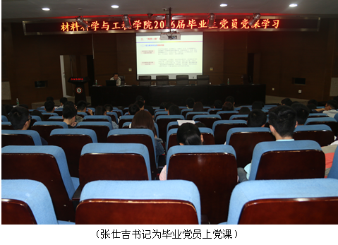 党委书记张仕吉以《要时刻做到心中有党》为主题给毕业生党员上了一堂生动的教育党课。张书记结合一些严重违法违纪的案例,从“始终牢记党员姓党”和 “时刻做到心中有党”两个方面进行了深度的解读,希望毕业生党员必须严格遵守党的政治纪律、政治规矩、组织纪律;牢固树立政治意识、大局意识、看齐意识、核心意识;毕业生党员要有党员的身份意识,做到心中时刻有党。