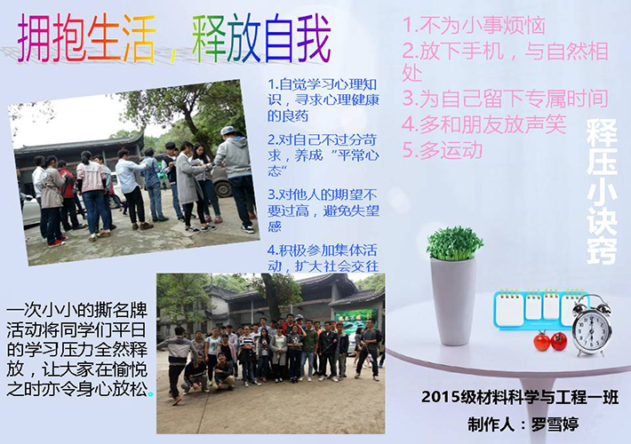 2016年5月,在材料学院团委学生会组织下以班级为单位开展了“拥抱生活,释放自我”主题活动。15级各班通过设计心理活动展板的方式积极参与到了活动中。