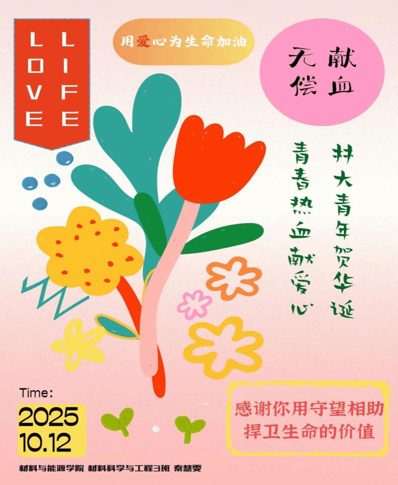 2025级材料科学与工程3班推进宣传海报制作。班级成员秦慧雯独立创作,以多彩手绘花朵为核心视觉元素,搭配“用爱心为生命加油”“无偿献血”等温馨标语,同时将“青春热血献爱心,共贺祖国华诞”的主题与国庆氛围相融合,在海报下方标注“感谢你用守望相助捍卫生命的价值”。完成后,这张海报被用作班级“贺华诞・献爱心”主题分享会的现场背景板,既展现出个人创意设计,又让活动现场的“贺华诞、献爱心”氛围更加浓厚,让参与分享的同学更有代入感。