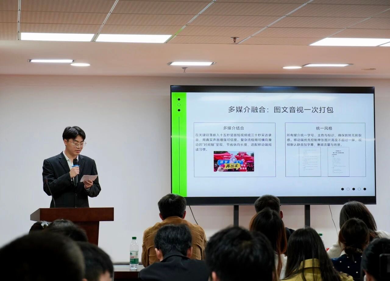 优秀部门代表、第十九届团委学生会文体部代表刘逸航、新闻中心代表李博海上台分享经验。他们总结了部门过去一年内完成的主要工作和取得的成就,并表示团委学生会是一个充满活力与凝聚力的团队,每位成员都是不可或缺的一部分。作为学生干部,应以积极的态度和饱满的热情投入每一项工作,共同建设一个更有活力、更具影响力的组织,为每位成员提供更广阔的成长平台。