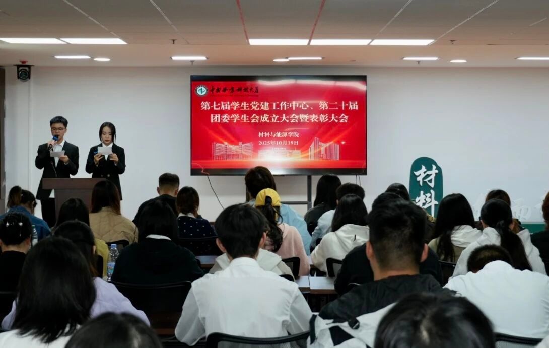 10月19日晚7点,材料与能源学院第七届学生党建工作中心、第二十届团委学生会成立大会暨表彰大会在逸夫楼B10多功能活动厅顺利举行。学院党委副书记成璐、学工办全体辅导员、第十九届团委学生会部长、第二十届团委学生会全体成员、第六届及第七届学生党建工作中心干部、2025级各班班长和团支书共200余人参会。会议由第二十届团委学生会执行主席孙琳睿和第七届学生党建工作中心副主任王宇杰主持。