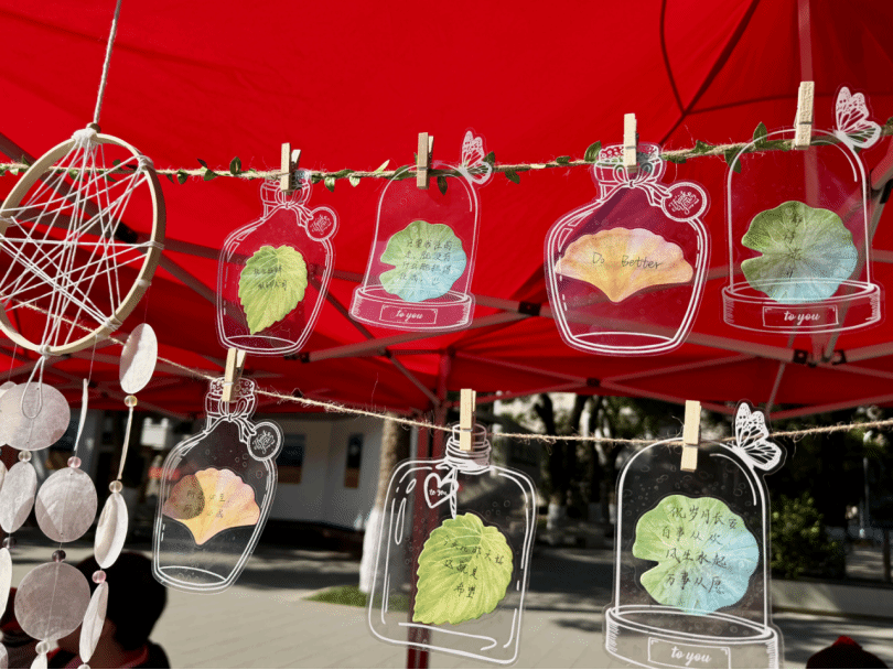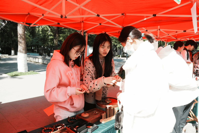 清香弥漫的摊位前,满载温情与祝福。考研学子们亲手选材、填充,制作寓意深远的专属香囊,为奋斗的征程增添一份安心的陪伴。