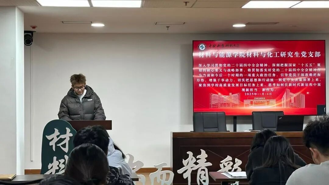 为深入学习贯彻党的二十届四中全会精神,精准把握国家“十五五”规划核心要义与战略部署,材料与能源学院各学生党支部于11月开展主题为 “深入学习贯彻党的二十届四中全会精神”的主题党日活动,以系统化学习筑牢思想根基,引导党员干部将思想和行动统一到党中央决策部署上来,为学校高质量发展与国家“十五五”建设蓄势赋能。