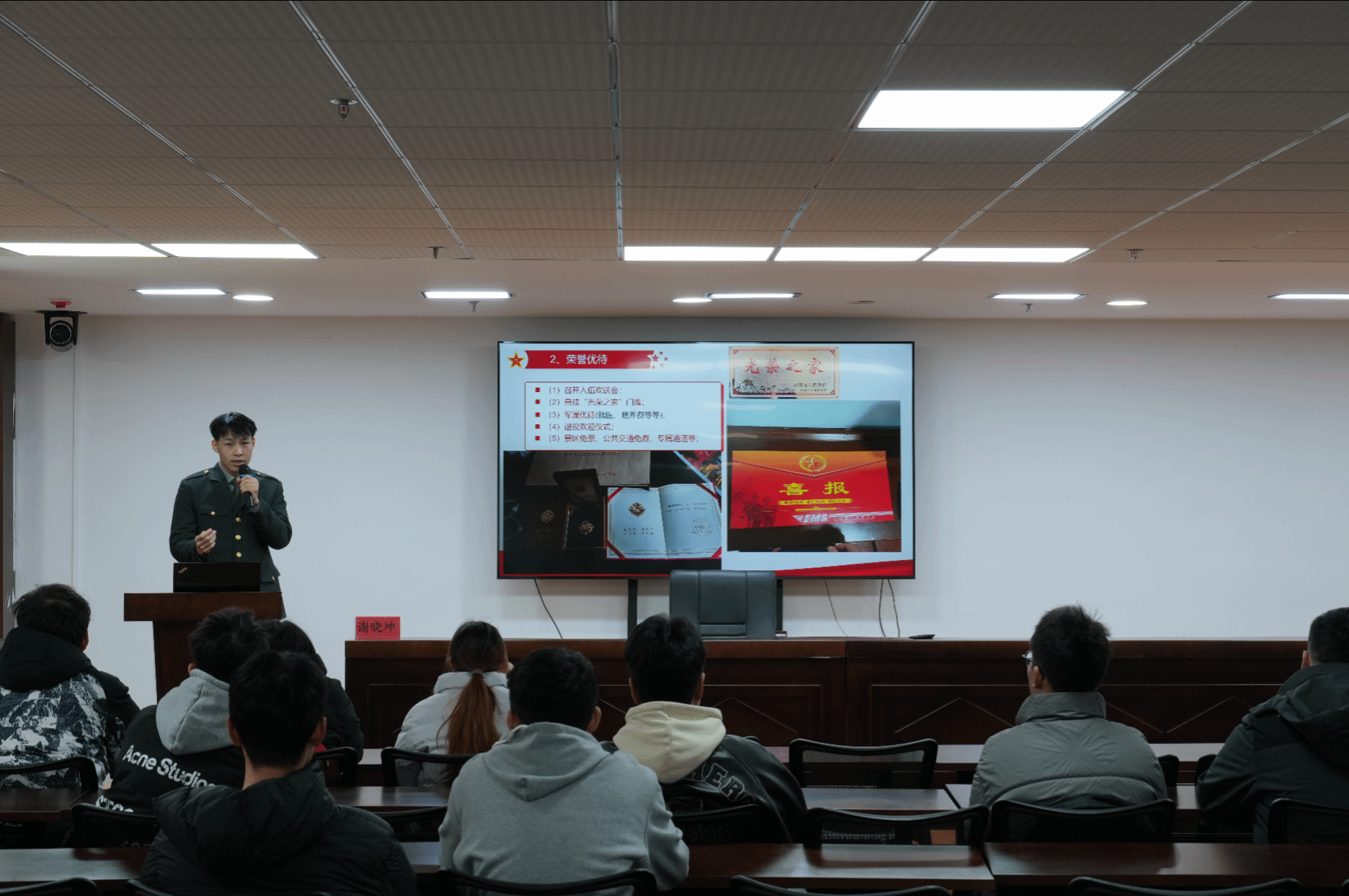 宣讲会上,谢晓坤围绕2026年春季征兵的相关政策与流程展开系统讲解。他详细地介绍了征兵报名条件、时间节点、体检标准、政治审查等具体要求,并结合最新政策文件,重点解读了大学生入伍享有的学费补偿代偿、升学优惠、就业扶持等专项优惠政策。此外,他还对同学们普遍关心的入伍流程、部队兵种选择、军营发展路径等问题进行了逐一解答,帮助同学们更加全面了解参军入伍的各方面信息,清晰规划个人发展。