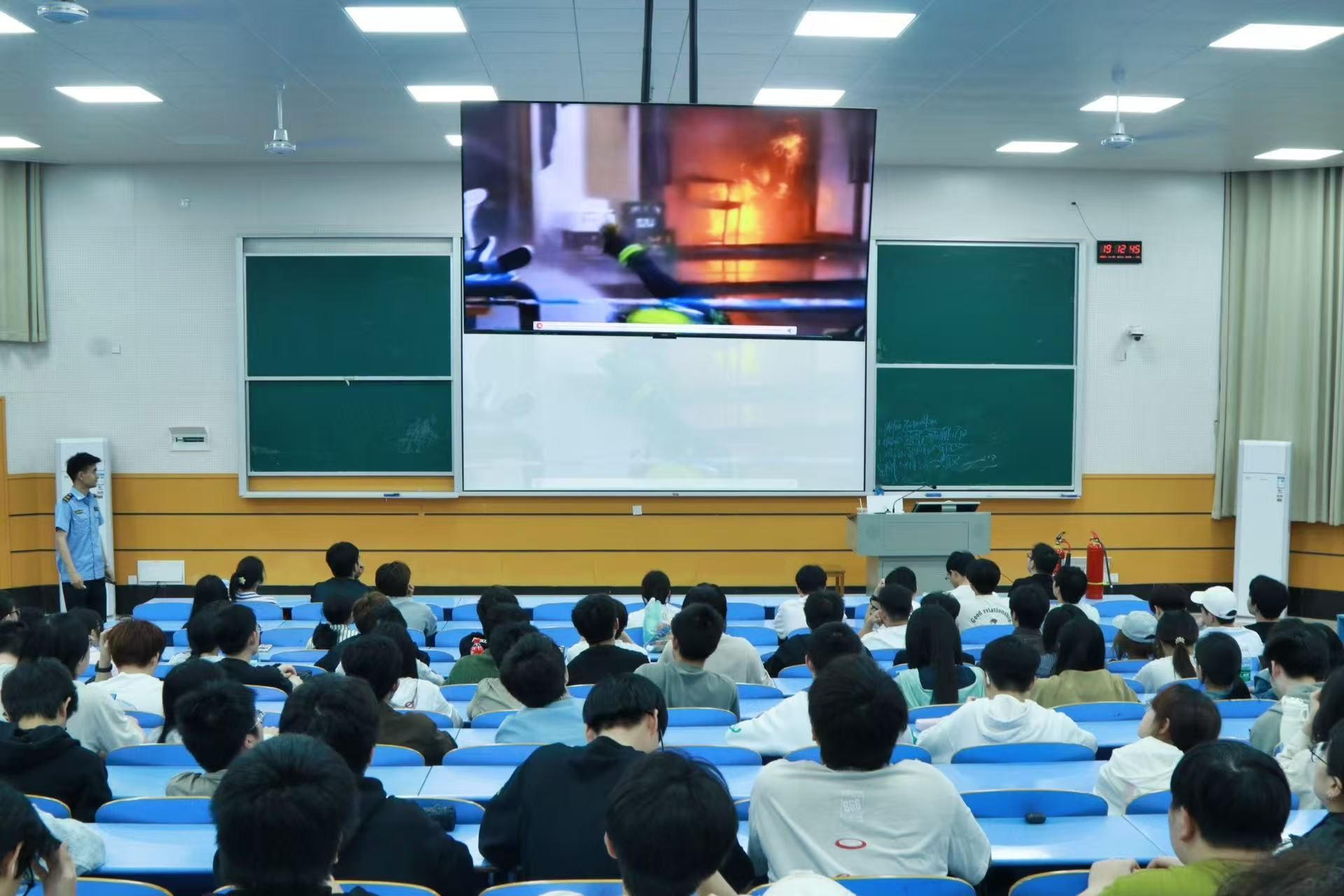 会上彭教官围绕宿舍用火用电安全、火灾应急处置方式、消防安全责任与警示三大核心内容展开系统详细讲解。