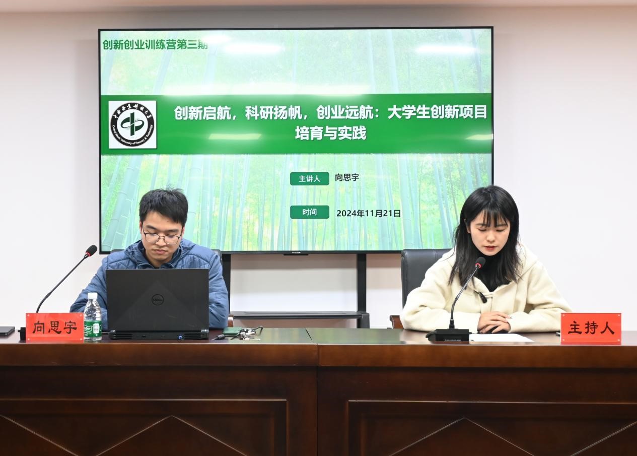 2024年11月21日19:00,“材院讲坛—名师面对面”第三期在逸夫楼B12(多功能活动厅)顺利召开。本次讲坛邀请到了我院木结构建筑与材料系向思宇老师做了题为“创新启航,科研扬帆,创业远航:大学生创新项目培育与实践”的交流报告。创新创业训练营全体营员参加本次讲坛,讲坛由2024级辅导员丁婧琳老师主持。