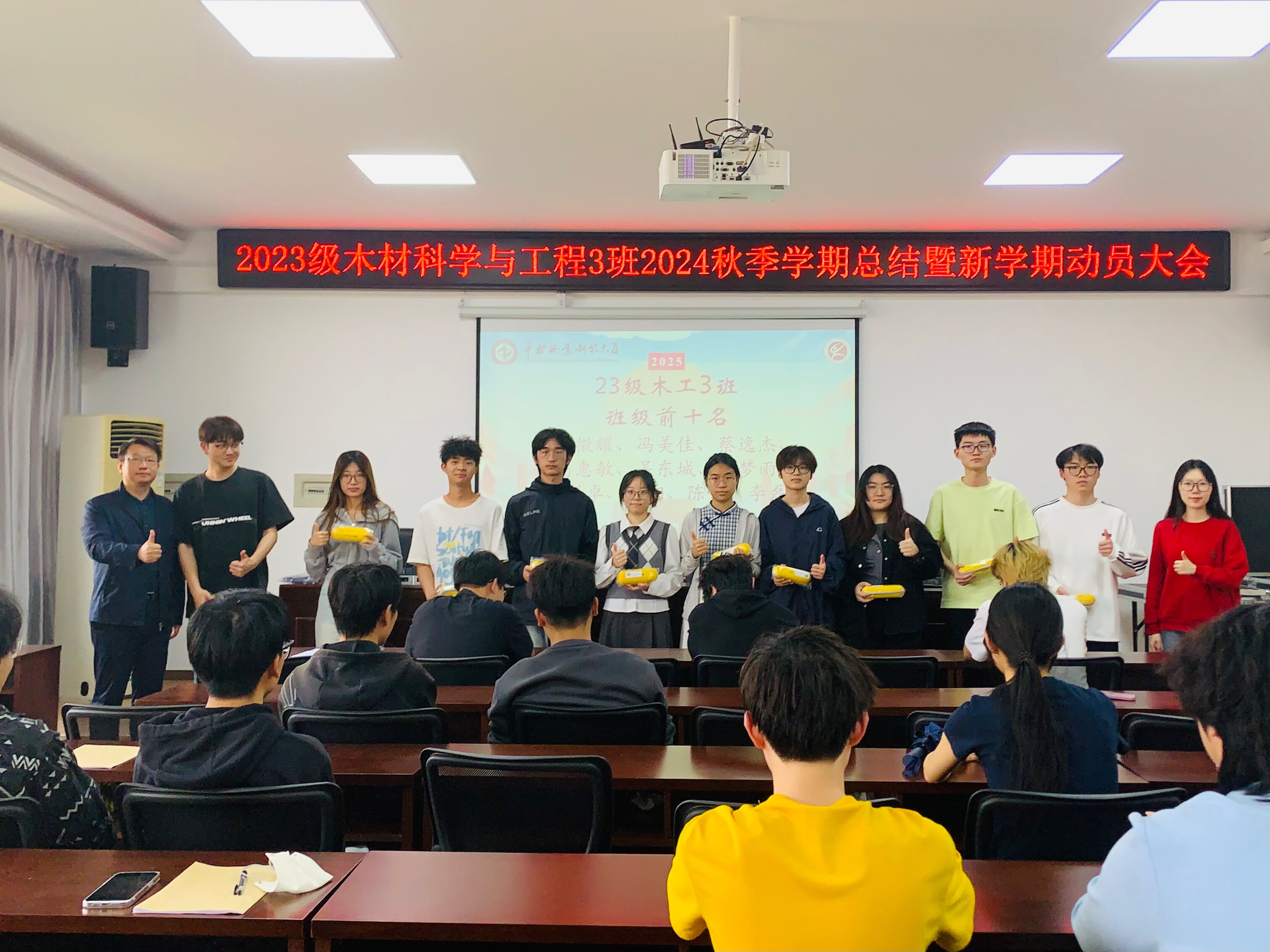 3月27日下午15:00,23级木材科学与工程3班在逸夫楼633开展2024秋季学期总结暨新学期动员大会,本次会议由班长冯美佳同学主持,参会人员有23级辅导员周如水老师、木工3班班主任陶涛老师以及23级木工3班全体同学。