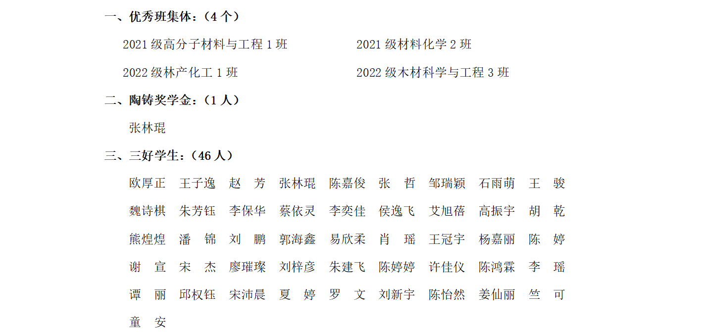 根据学校《关于开展2022-2023学年学生评优、评奖工作的通知》要求,按照本年度修订后的《材料科学与工程学院本科学生评优评奖实施细则》实施,经学生本人申请、班级推荐及民主评议等程序,学院拟定2022-2023学年本科生“评优”“评奖”初评结果。