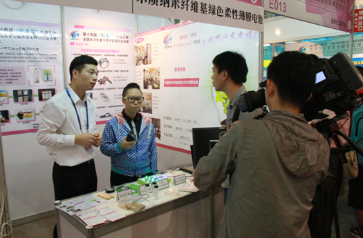“木质纳米纤维基绿色柔性薄膜电池”项目团队由我院卿彦博士担任指导老师,团队研发的是一款柔性可折叠、性能优越、绿色环保的电池。其85%的原料源于自然,主要是木材、竹材和农作物秸秆等木质资源。该项目不仅能解决传统电池污染问题,同时实现了秸秆等废弃物再利用,真正做到了源于自然,还于自然。在比赛期间,湖南团省委副书记罗琼视察“绿色薄膜电池”团队项目后给予该团队巨大的鼓励并表示非常看好该项目的发展前景。“挑战杯”组委会委员、专家也看好该项目并做出了专业性的指导。广州电视台、搜狐网络、广东高校传媒联盟等多家媒体媒也争先对该项目进行了现场采访报道。