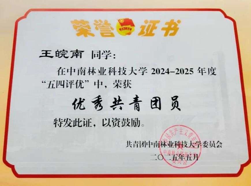 回首来路,王皖南同学始终践行热忱,笃行不怠。国家励志奖学金于他,既是一份奋进的勋章,更是一份热腾腾的动力与方向。展望新征程,他必将以此为新的坐标,在木材领域持续深耕,将青春热忱汇入时代发展浪潮,不负韶华,不负初心,奋力成长为能担时代发展重任的青年先锋。