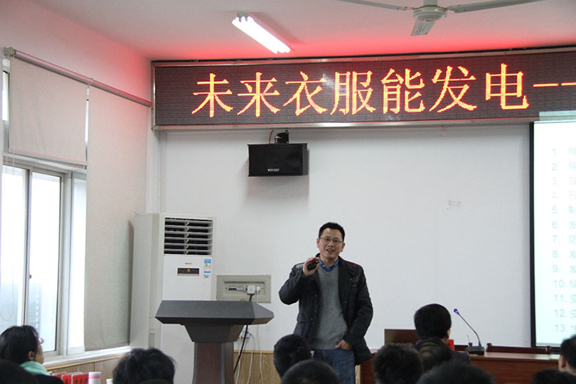 随后,彭慧胜教授作了题为“未来衣服能发电----可穿戴的纤维状能源器件”的学术报告,重点介绍一类新型纤维状的太阳能电池、锂离子电池和超级电容器,在航空、航天、军事、医学、电子等广泛领域都显示了重要的应用;他指出:这些新型纤维状能源器件可望带来新的科技革命,改变人们的生活方式,如可穿戴设备被认为是下一个全球工业革命的突破口,但目前相对笨重的供能系统无法满足其轻质、柔性、可集成等综合性能要求,而新型纤维状能源器件可望解决上述瓶颈问题。