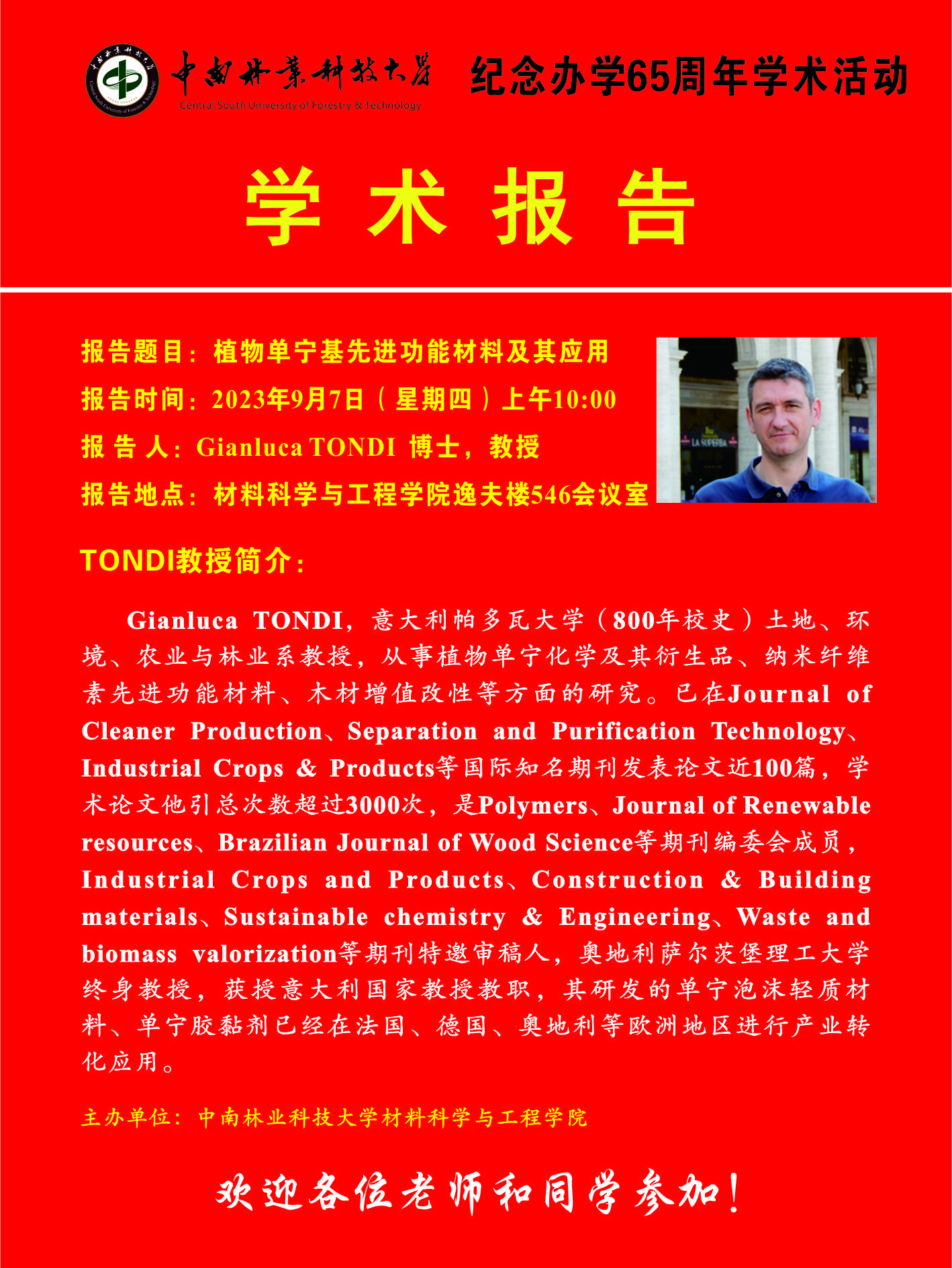 Gianluca TONDI,意大利帕多瓦大学 (800年校史 ) 土地、环境、农业与林业系教授,从事植物单宁化学及其衍生品、纳米纤维素先进功能材料、木材增值改政性等方面的研究。已在Journal ofCleaner Production、Separation and Purification Technology、Industrial Crops & Products等国际知名期刊发表论文近100篇,学术论文他引总次数超过3000次,是Polymers、Journal of Renewableresources、Brazilian Journal of Wood Science等期刊编委会成员Industrial Crops and Products、 Construction & Buildingmaterials、Sustainable chemistry & Engineering、 Waste andbiomass valorization等期刊特邀审稿人,奥地利萨尔茨堡理工大学终身教授,获授意大利国家教授教职,其研发的单宁泡沫轻质材料、单宁胶黏剂已经在法国、德国、奥地利等欧洲地区进行产业转化应用。