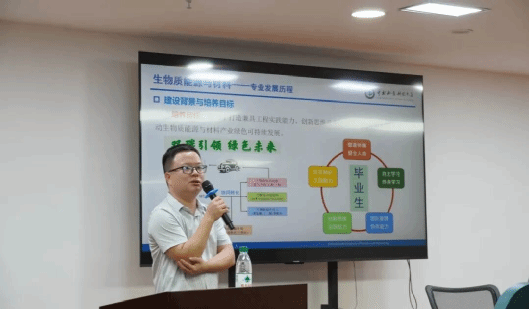 邵礼书围绕生物质能源与材料专业展开主讲,介绍其建设背景为依托国家A类学科林业工程等,2025年4月获批设立;培养目标是打造兼具工程实践能力、创新思维的人才,推动产业绿色可持续发展;还讲解了核心课程,涵盖生物质能源、材料、化学工程等领域相关课程。