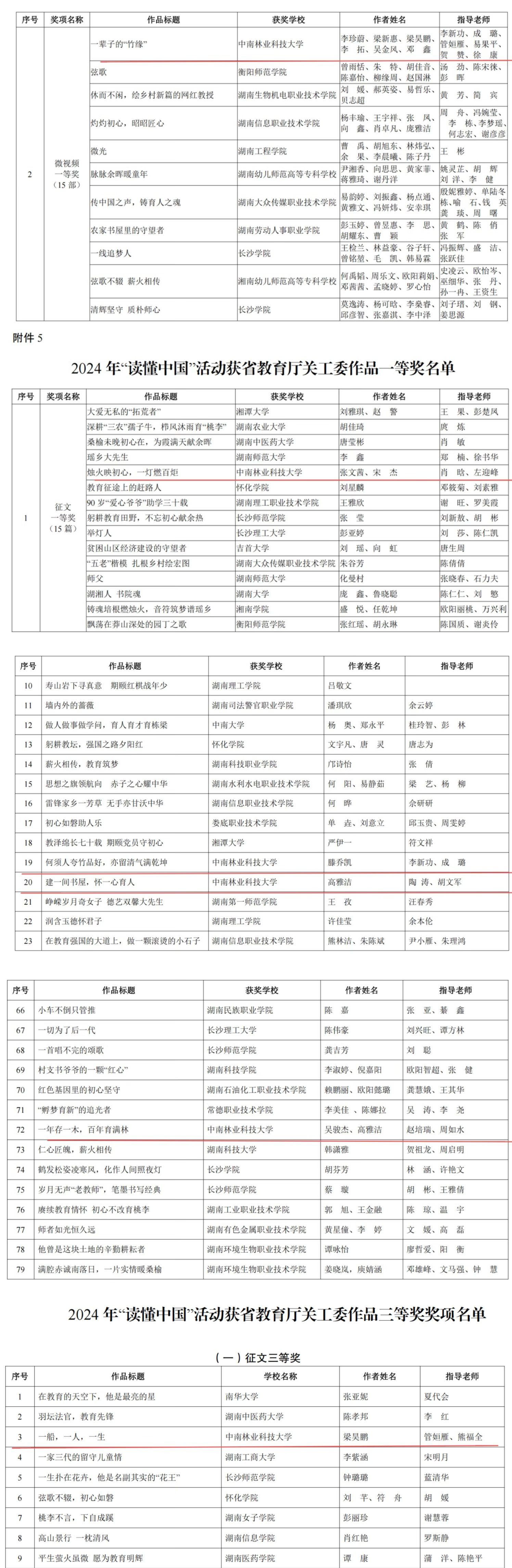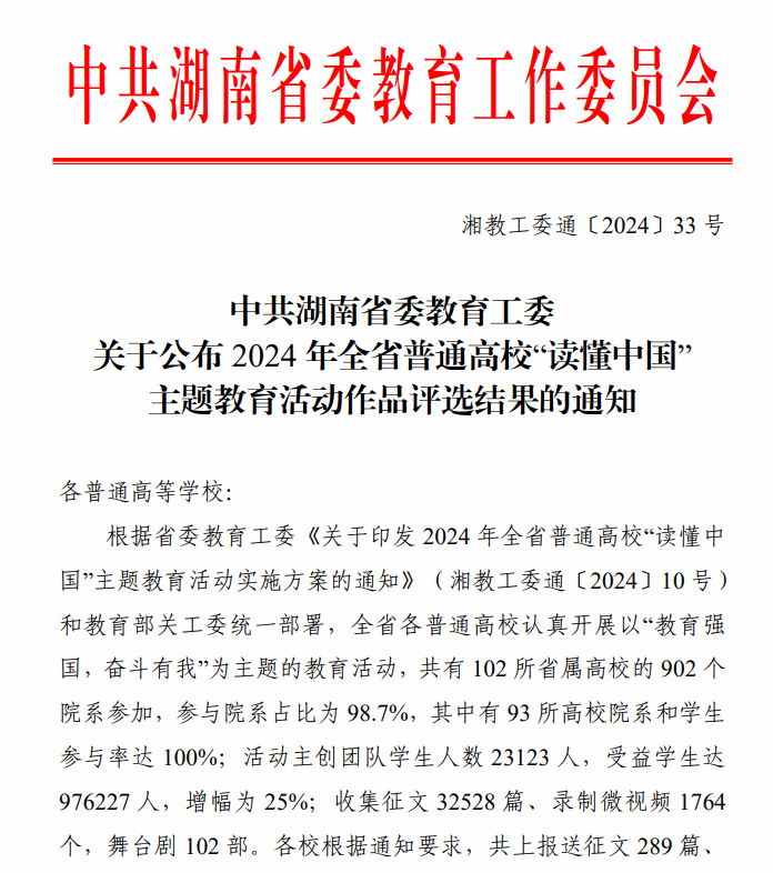 近日,湖南省教育厅公布了2024年“读懂中国”主题教育活动获奖名单,在全省32528篇征文和1764个微视频作品中,我院报送的《一辈子的“竹”缘》荣获微视频组一等奖,主题征文获一等奖一项、二等奖两项、三等奖一项,学院获教育厅关工委点名表扬,并荣获优秀组织单位称号。