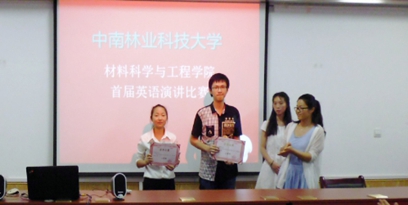 经过在场评委的综合考评和专业评定,刘祥获得一等奖;陈金宇、苏雨获得二等奖;刘恒松、郑薇、宁锦迪获得三等奖;鲁钰雯、王婉戎、陈仕清获得优胜奖。来自2014级林化一班的刘祥、2013级木工4班的陈金宇、2013级高分子一班的苏雨将代表材料学院参加学校的英语演讲比赛。
