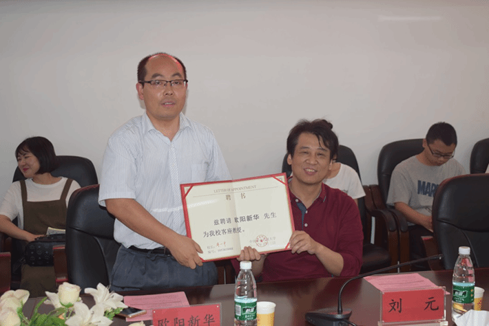 学术报告会之前,举行了欧阳新华教授受聘我校客座教授仪式;刘元副校长、材料科学与工程学院李贤军院长及学院相关专业师生参加此次受聘仪式。院长李贤军教授介绍欧阳新华教授基本情况;副校长刘元教授致辞热情欢迎欧阳新华教授来我校访问、兼任客座教授,并颁发聘书;也希望籍此进一步加强我校相关专业师生与欧阳新华教授团队的深入合作。