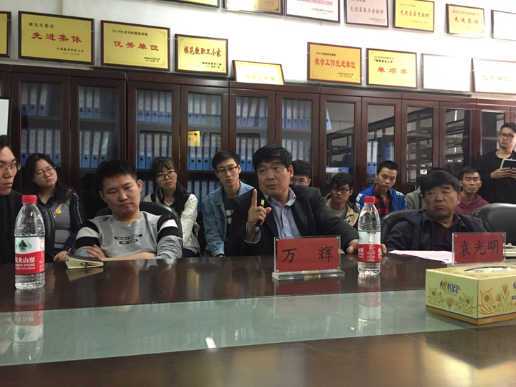 学术报告会之前袁光明教授简要介绍了万辉博士的基本情况,随后万辉博士就近年来在林产品和林产工业方面开展的研究工作,重点介绍了林产品教育、林业产业现状、未来林产品工业发展趋势。