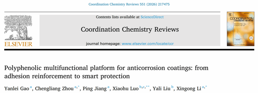 近日,我院李新功教授团队在《Coordination Chemistry Reviews》发表了题为“Polyphenolic Multifunctional Platform for Anticorrosion Coatings: from Adhesion Reinforcement to Smart Protection”的综述论文。我院2023级高分子材料与工程专业2班高艳雷为第一作者,李新功教授与周城良博士为通讯作者,中南林业科技大学为论文第一完成单位。