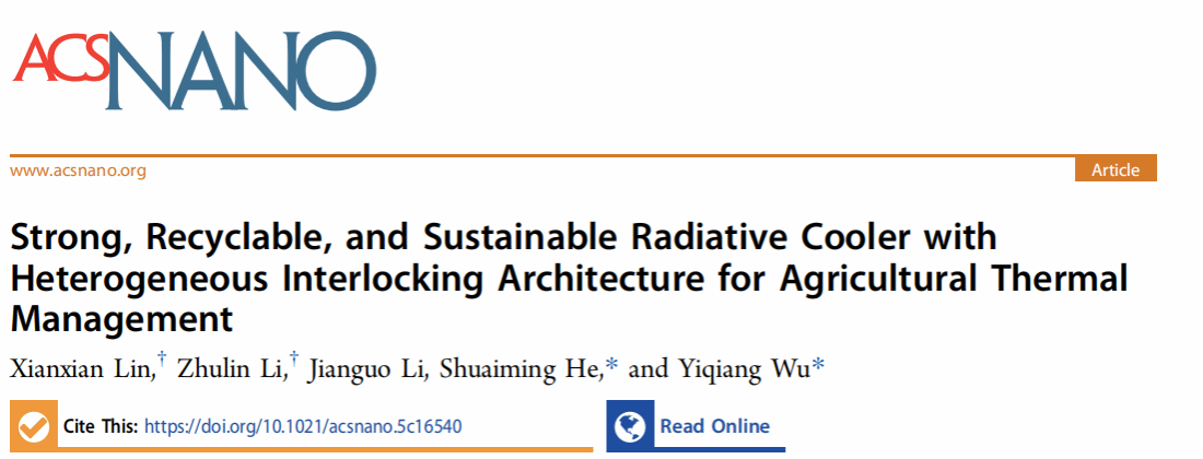 近日,我院吴义强院士、何帅明教授研究团队在国际知名期刊《ACS Nano》发表了题为"Strong, Recyclable, and Sustainable Radiative Cooler with Heterogeneous Interlocking Architecture for Agricultural Thermal Management"(一种坚固、可回收且可持续的异质互锁结构辐射制冷器用于农业热管理)的研究论文。我院博士研究生林贤铣为第一作者,吴义强院士与何帅明教授为该论文的通讯作者,中南林业科技大学为唯一完成单位,该成果得到了国家自然科学基金等项目支持。随着全球气候变暖和能源危机的加剧,开发高效的被动制冷技术对于缓解农业热应激和保障粮食安全具有重要意义。传统的石油化工基辐射制冷材料虽然能够实现一定的制冷效果,但面临持久性废弃物带来的环境挑战;而新兴的生物质替代材料则往往存在制冷性能不足、机械强度差及耐久性有限等问题。因此,开发一种兼具高制冷性能、优异机械强度和可持续循环利用的新型辐射制冷材料成为当前研究热点。这篇文章深入研究了异质互锁结构的构筑策略及其光学特性与力学特性,开发出一种一体化、高强度、可回收的竹基辐射制冷材料。该材料以竹纤维为基质,运用真空辅助分级自组装策略,将纳米颗粒引入连续的聚合物网络中,构筑成异质互锁的多层次结构。文章进一步探讨了该材料在农业热管理方面的能力,并深入解析了其力学性能增强与高效光散射的机制。该材料展现出98.1%的太阳反射率和93.2%的红外发射率,实现了低于环境温度的制冷效果,同时具有38.7 MPa的高抗拉强度,显著优于商用反射地膜。田间试验表明,该材料可使土壤温度较裸土降低4.6℃、较商用地膜降低2.4℃,同时抑制土壤蒸发并提高作物产量。尤为关键的是,该材料可通过温和的水介导回收工艺高效再生,回收率超过90%,大幅减轻了农业废弃物对环境造成的负担。最后,文章指出该竹基辐射制冷材料有望应用于温室农业节能领域,为加速开发高性能、生态友好型农业热管理复合材料提供新型解决方案。